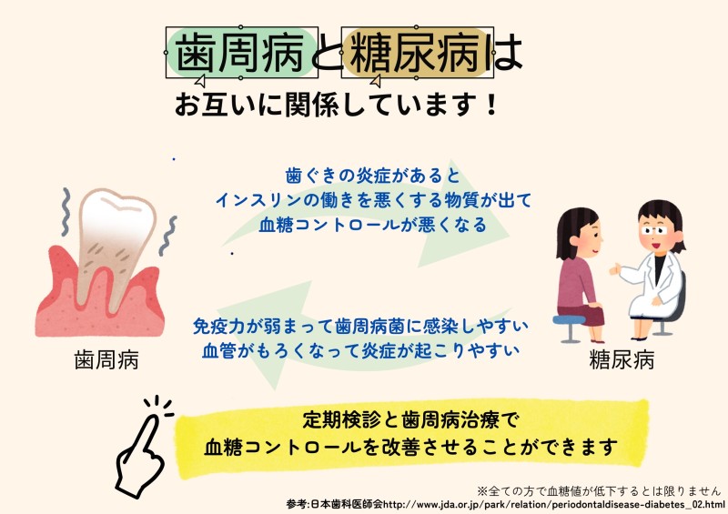歯周病と糖尿病 2024.09.21 診療トピック こんにちは竹田歯科医院です😊今回は「歯周病と糖尿病」について情報をお届けします✨現在当院では、診療に必要な情報を医科と歯科で共有するため、糖尿病のある方にはかかりつけの内科の先生宛てにお手紙を書いてお渡ししています。歯周病の治療は血糖値の改善にも繋がりますので、みなさまのご協力よろしくお願いいたします🍁 前ページへ戻る